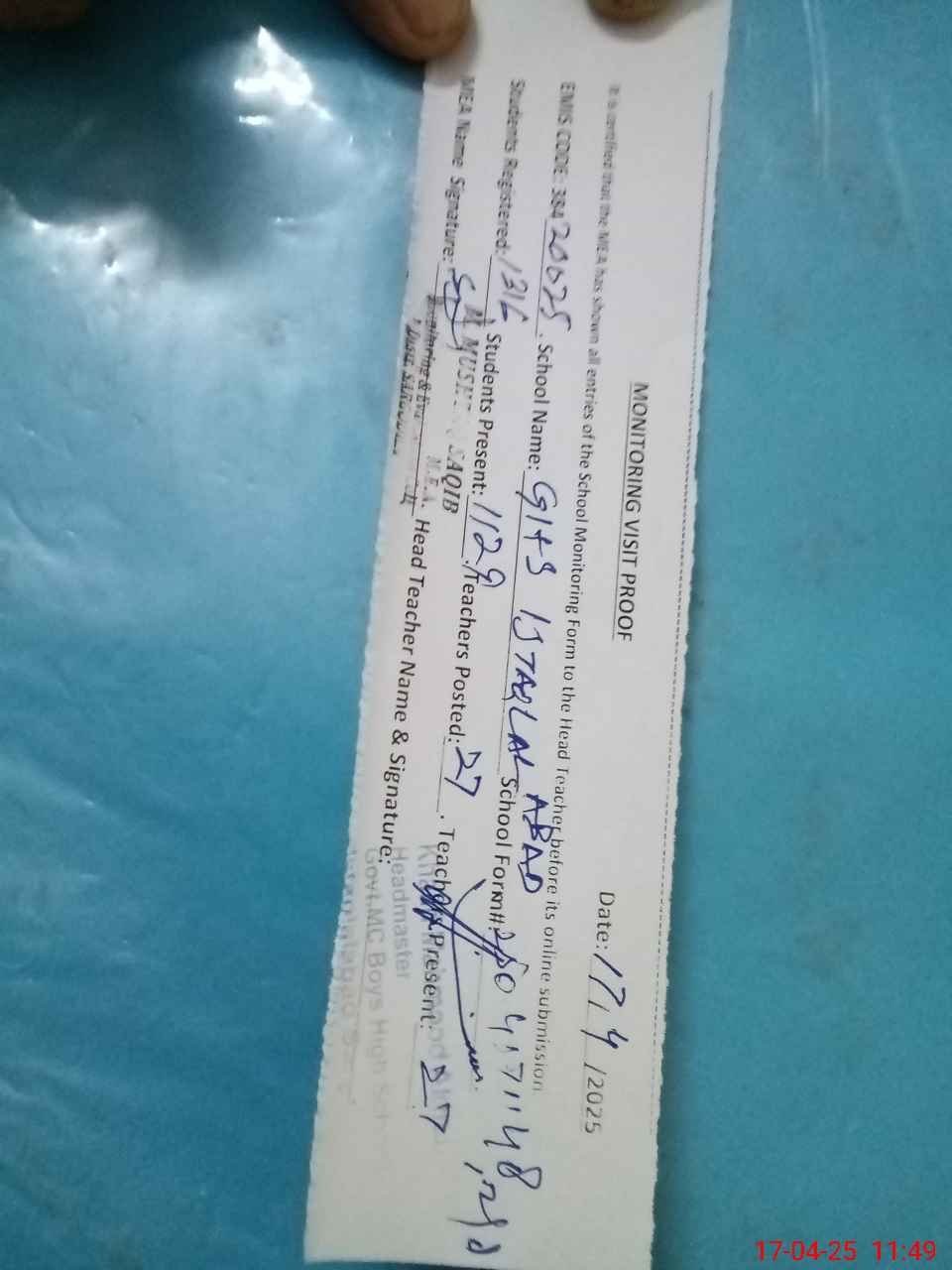 | Attendance Register | Head Teacher | MEA with School | Visit Proof |