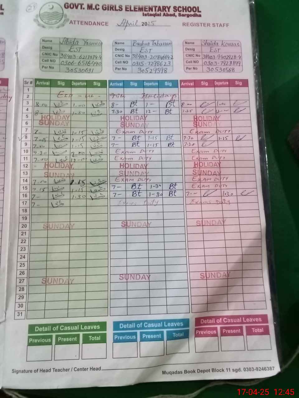 | CNIC | Full Name | Designation | R/C | Absence During Last Calender Month |