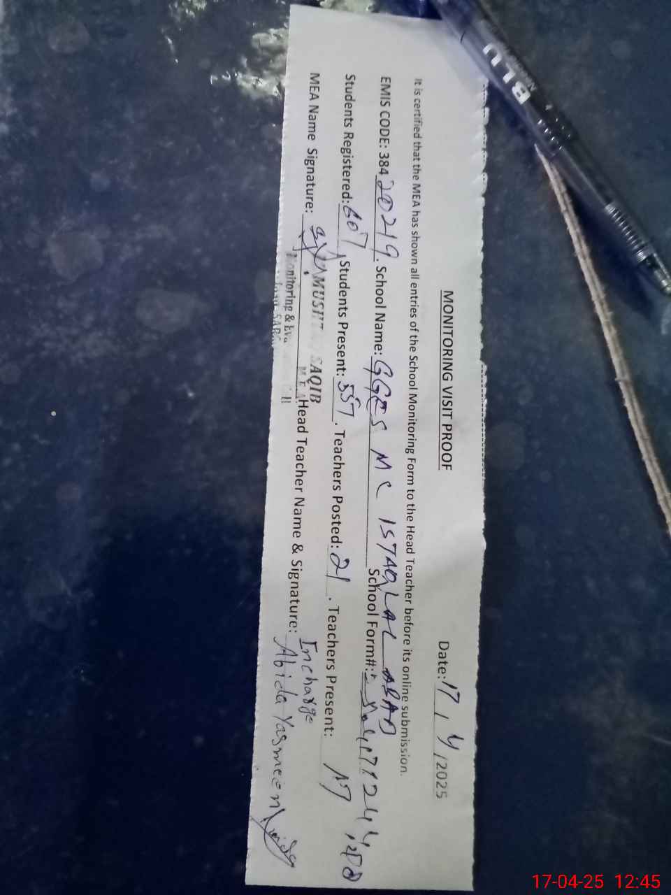 | Attendance Register | Head Teacher | MEA with School | Visit Proof |