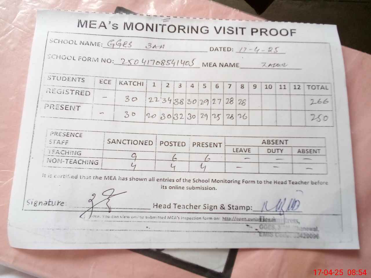 | Attendance Register | Head Teacher | MEA with School | Visit Proof |