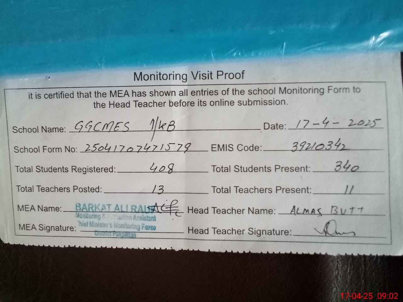 | EMIS Code: 39210342 | Name of School: GGCMES 1 KB PAKPATTAN | |||