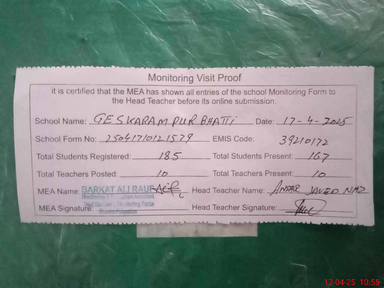 | Attendance Register | Head Teacher | MEA with School | Visit Proof |