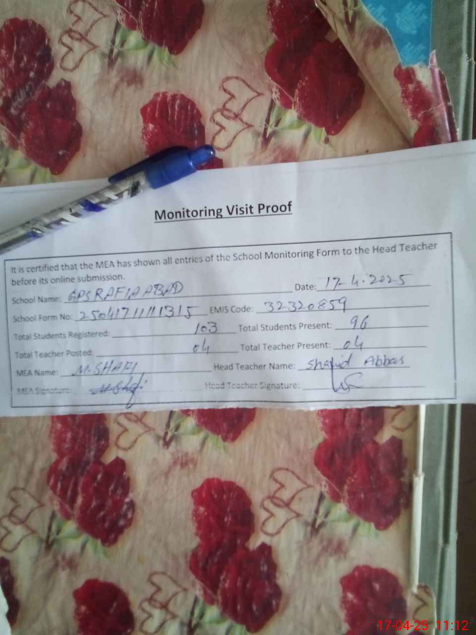 | Attendance Register | Head Teacher | MEA with School | Visit Proof |