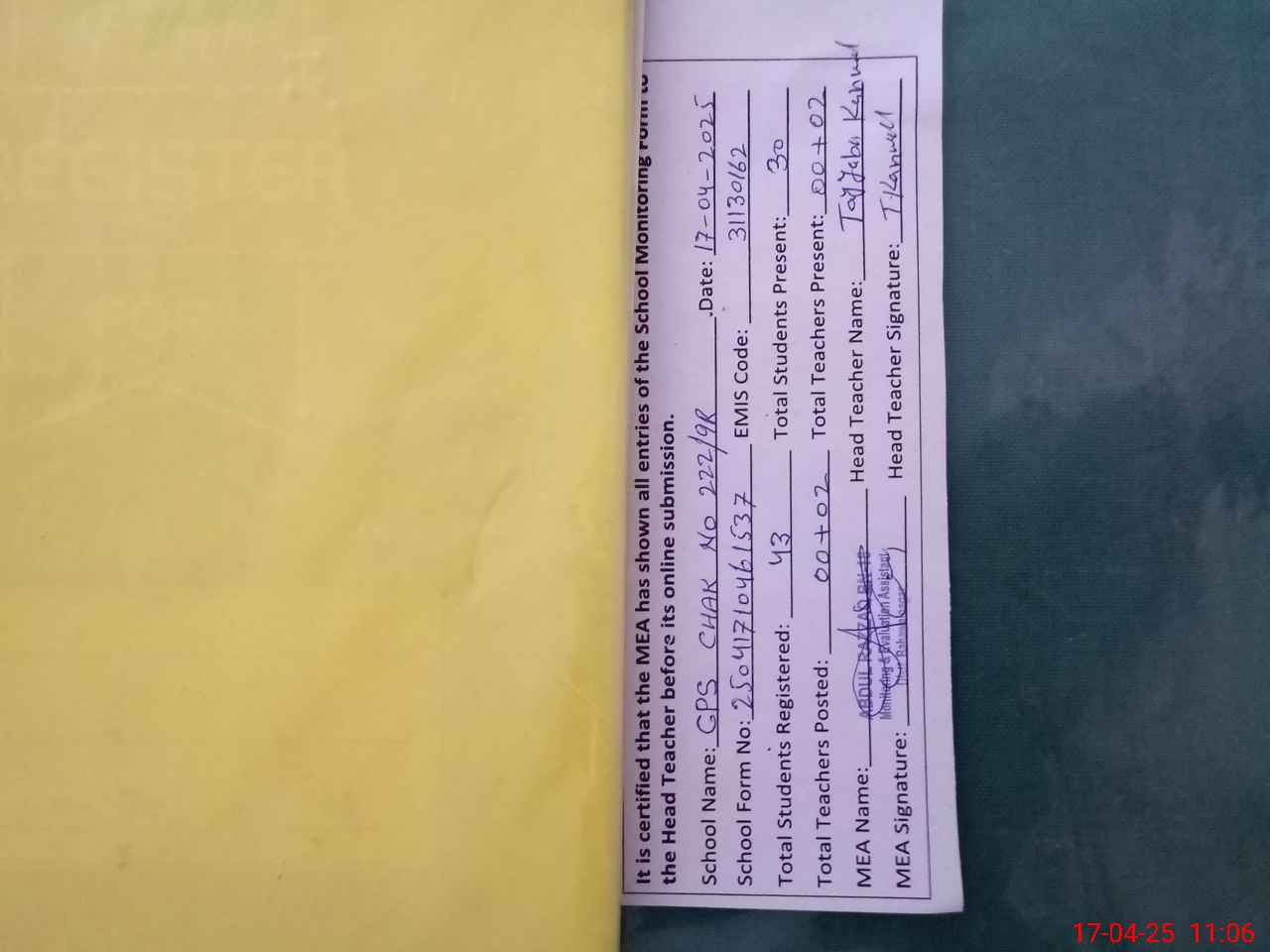 | EMIS Code: 31130162 | Name of School: GPS CHAK NO.222/9-R | |||