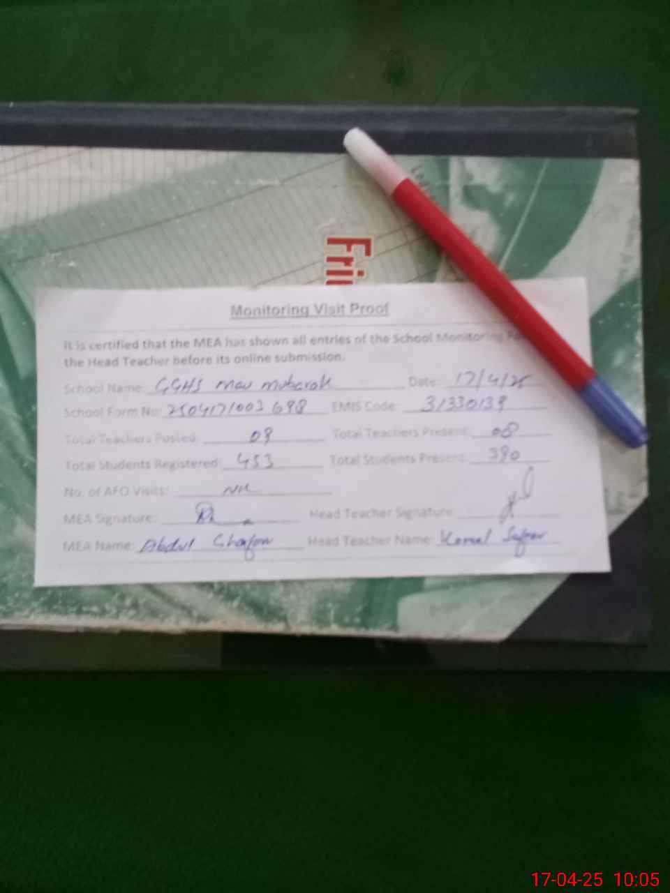 | Attendance Register | Head Teacher | MEA with School | Visit Proof |