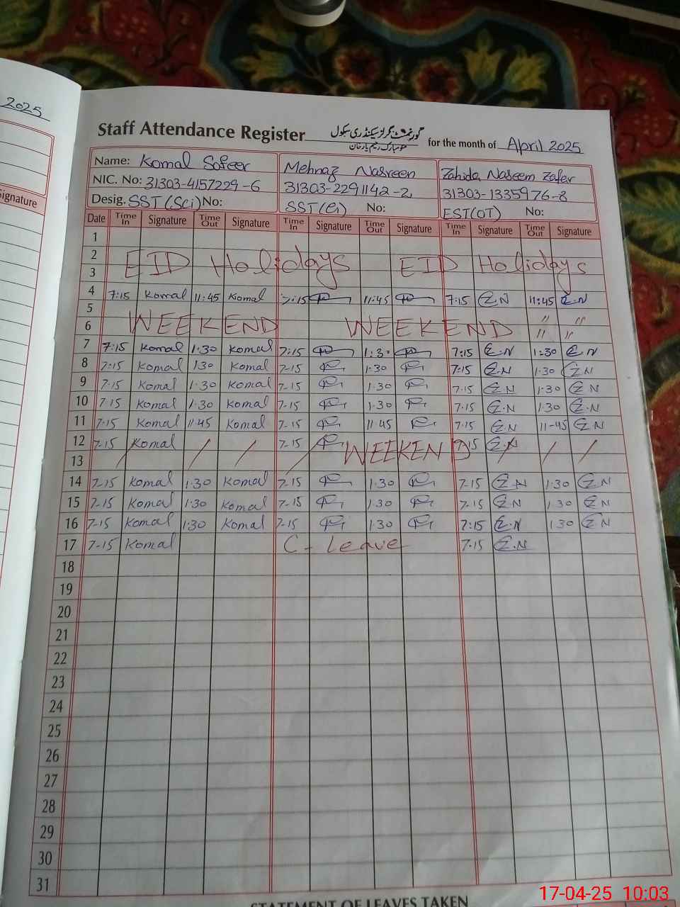 | CNIC | Full Name | Designation | R/C | Absence During Last Calender Month |