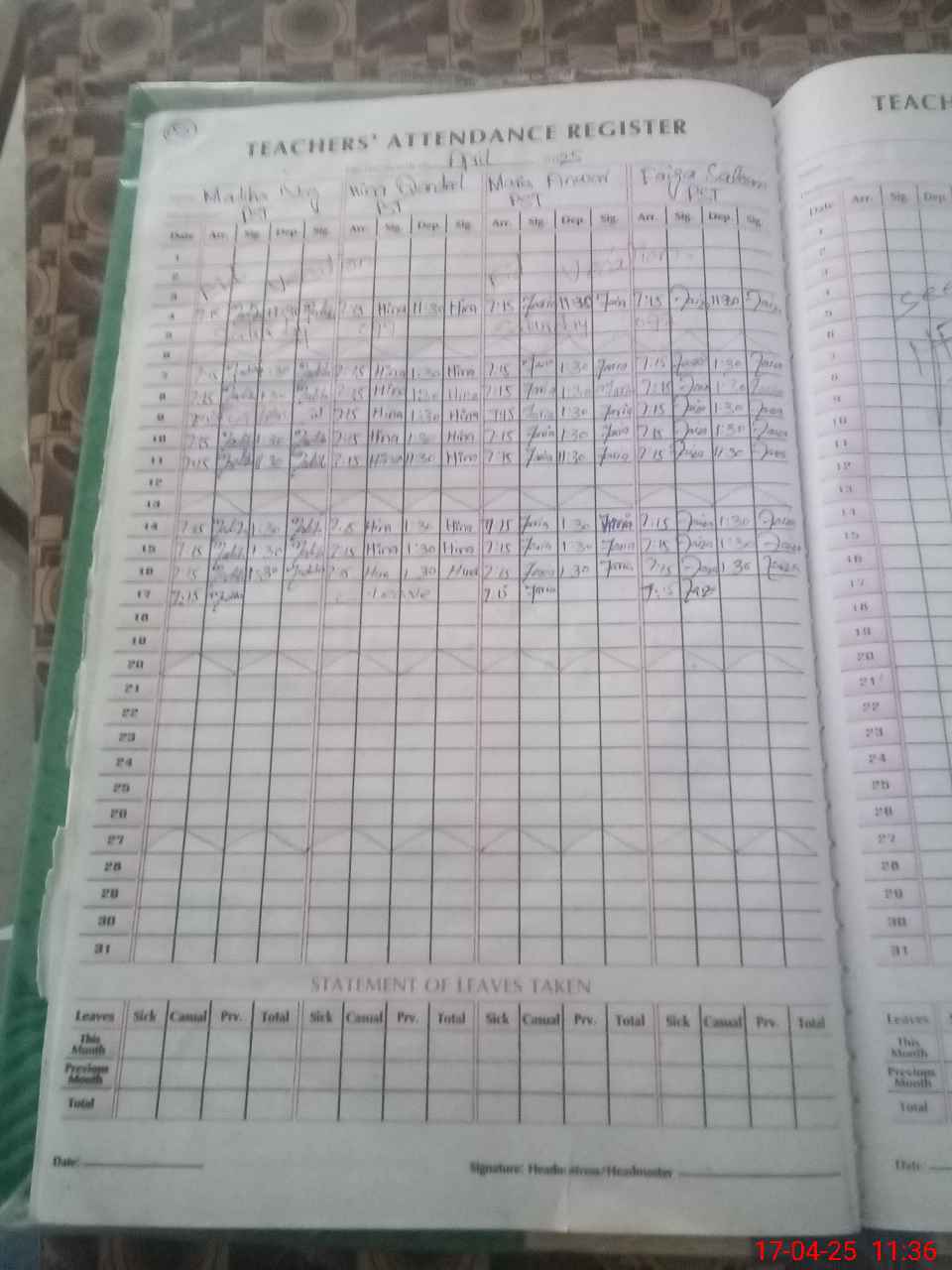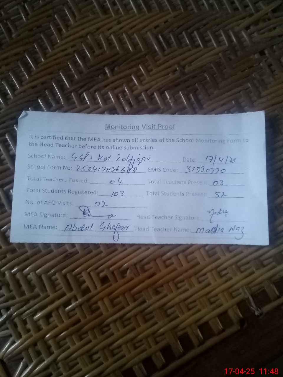 | Attendance Register | Head Teacher | MEA with School | Visit Proof |
