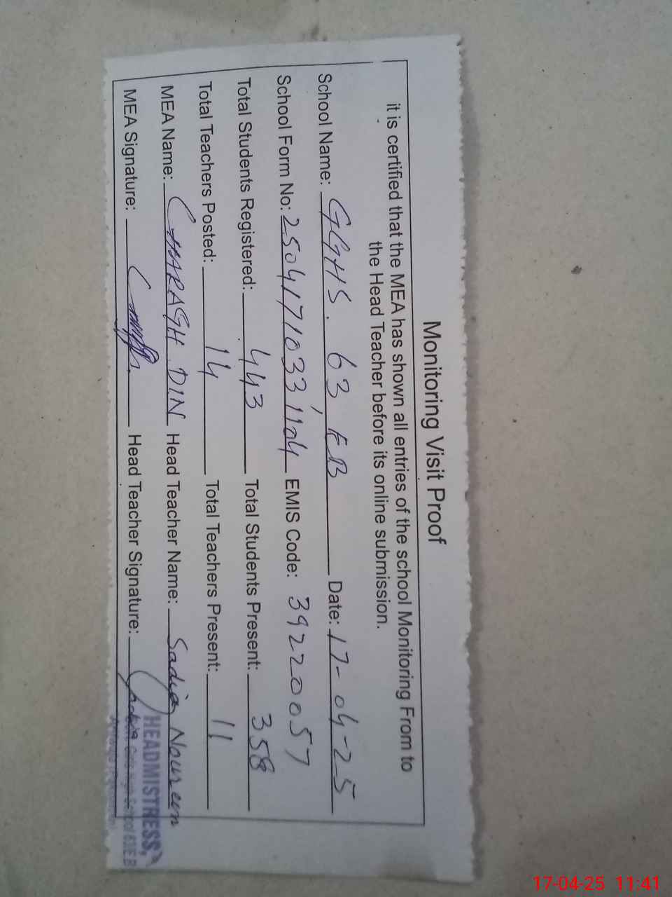 | EMIS Code: 39220057 | Name of School: GGHS 63 EB | |||