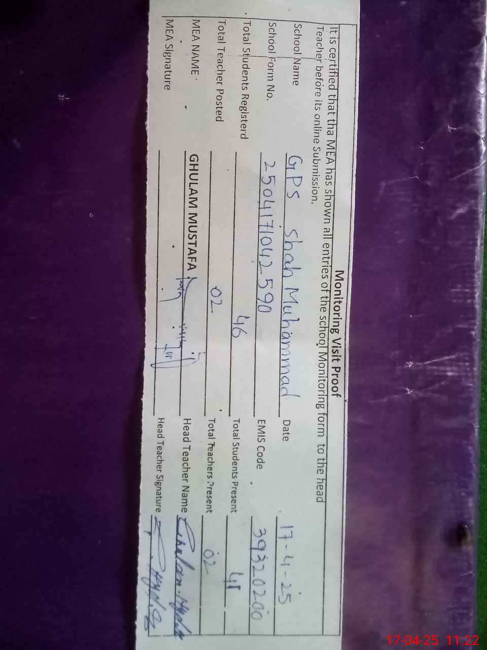 | Attendance Register | Head Teacher | MEA with School | Visit Proof |