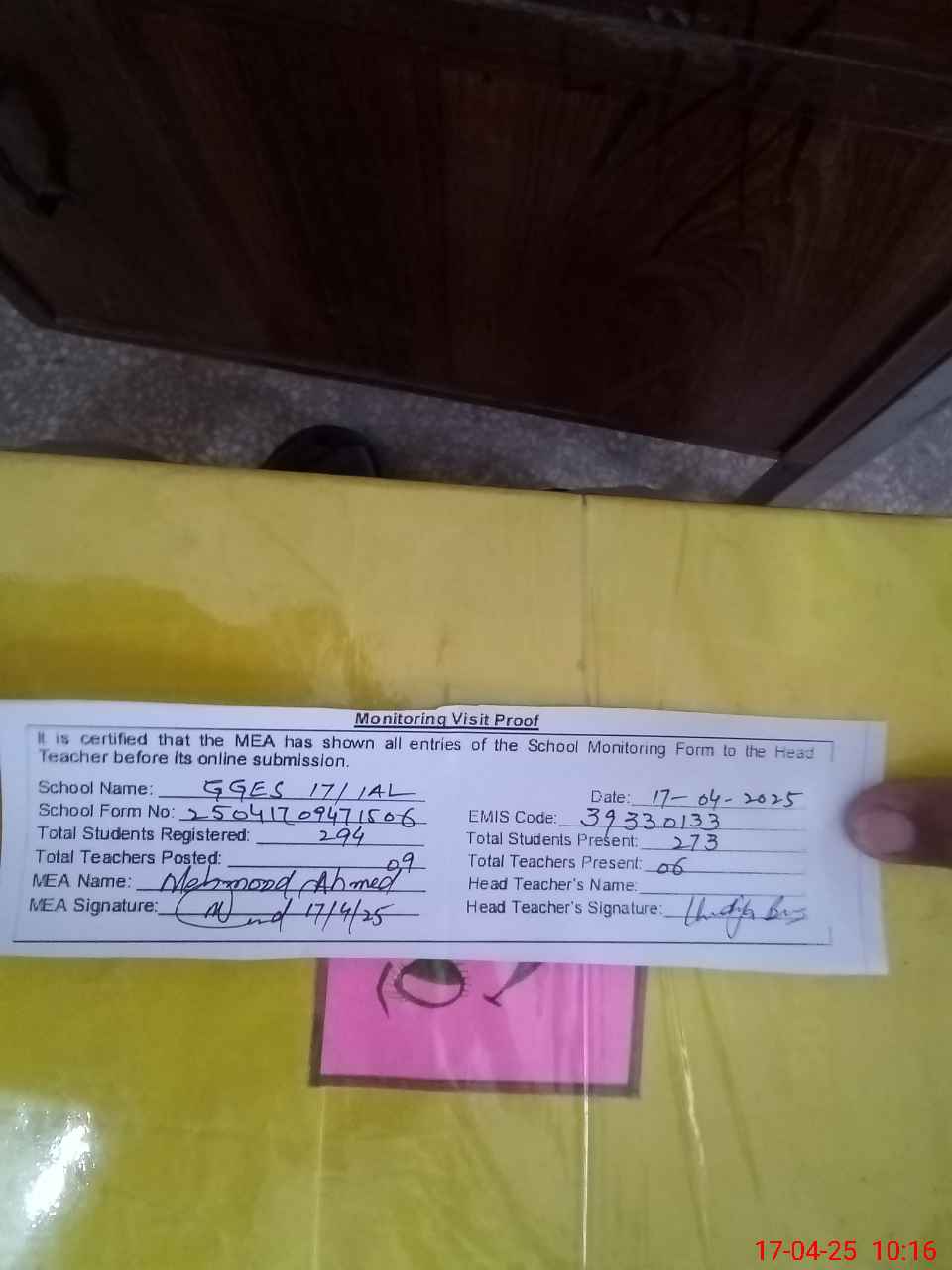 | Attendance Register | Head Teacher | MEA with School | Visit Proof |
