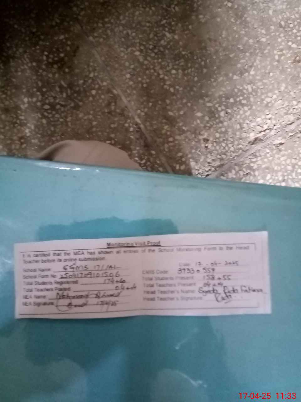 | Attendance Register | Head Teacher | MEA with School | Visit Proof |