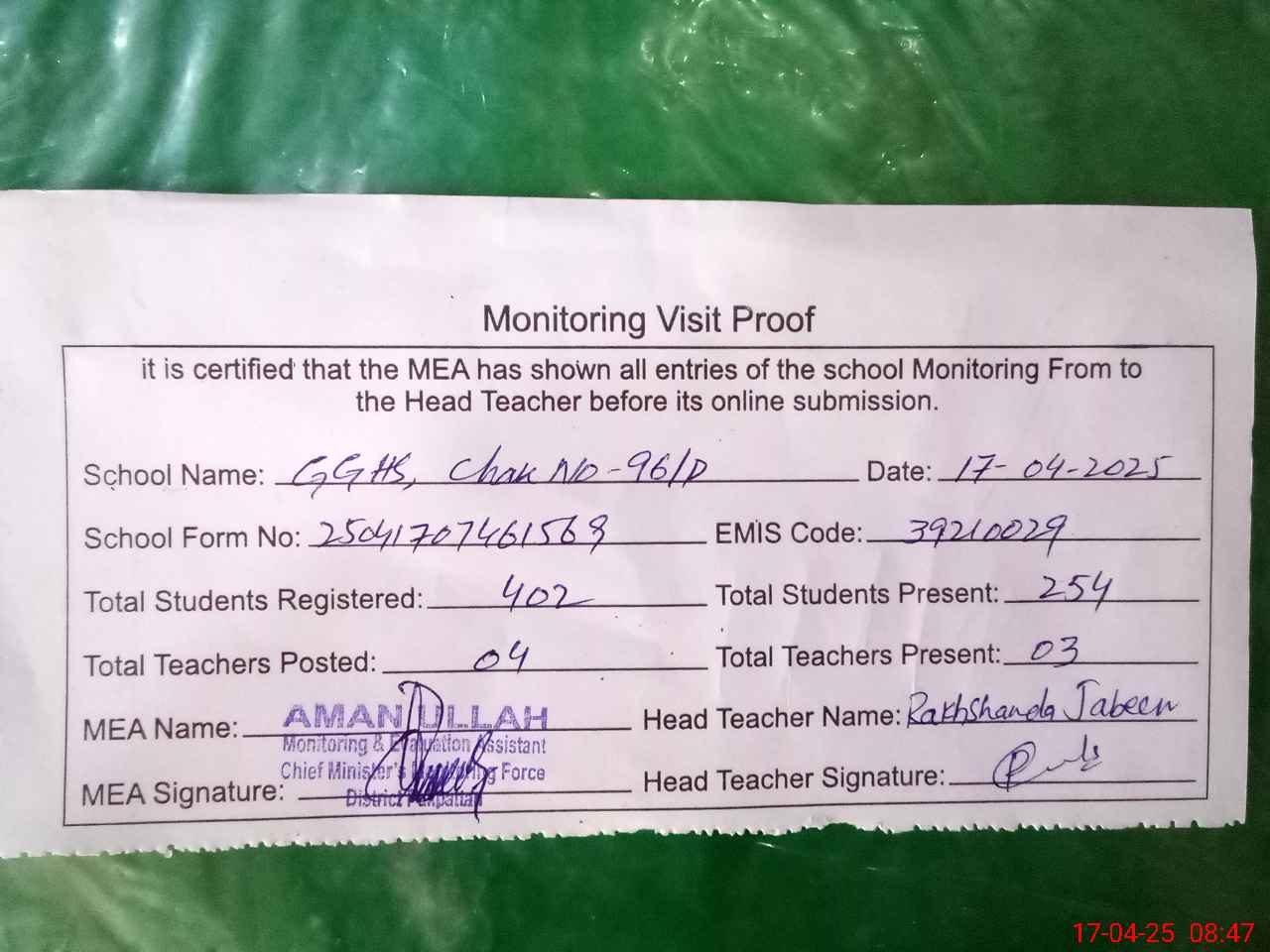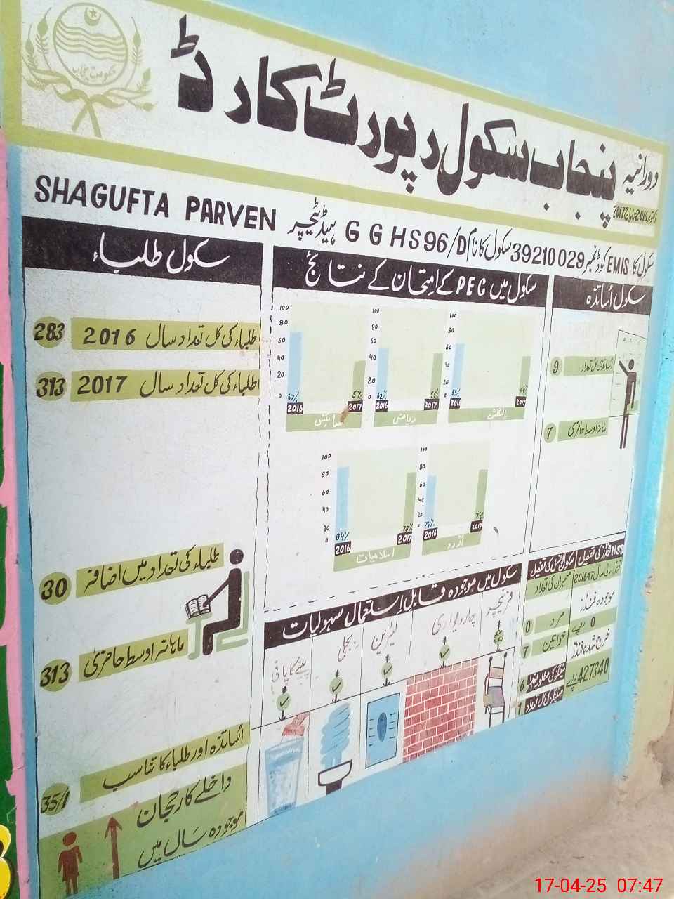 | EMIS Code: 39210029 | Name of School: GGHS CHAK NO. 96 D | |||