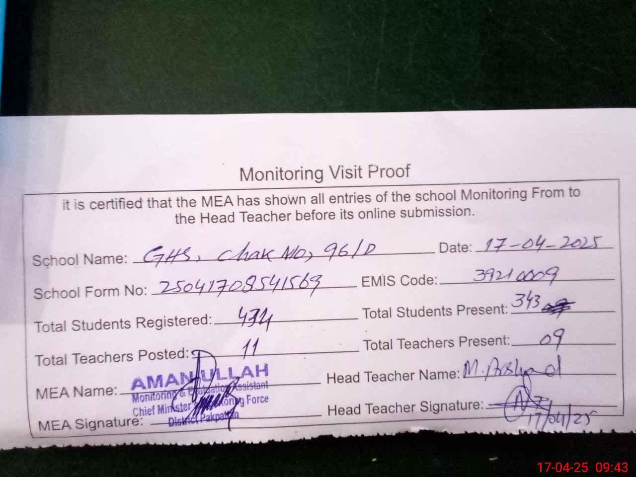 | Attendance Register | Head Teacher | MEA with School | Visit Proof |