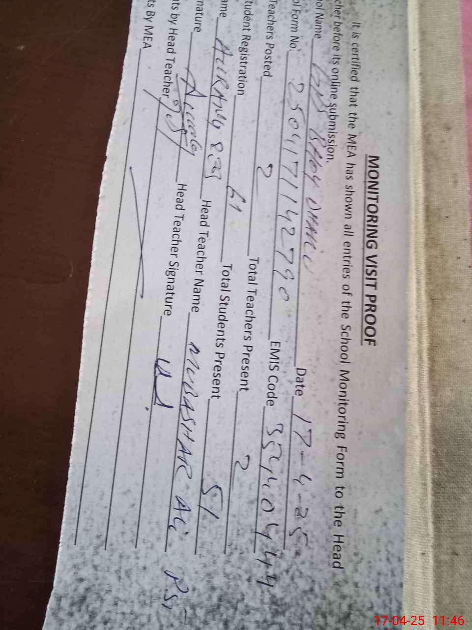| Attendance Register | Head Teacher | MEA with School | Visit Proof |