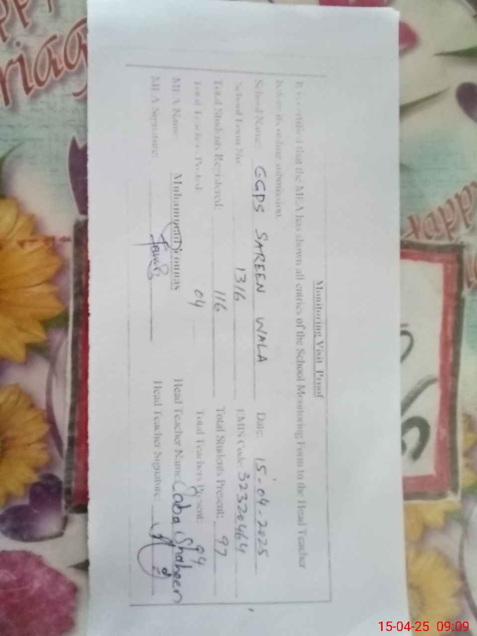 | Attendance Register | Head Teacher | MEA with School | Visit Proof |