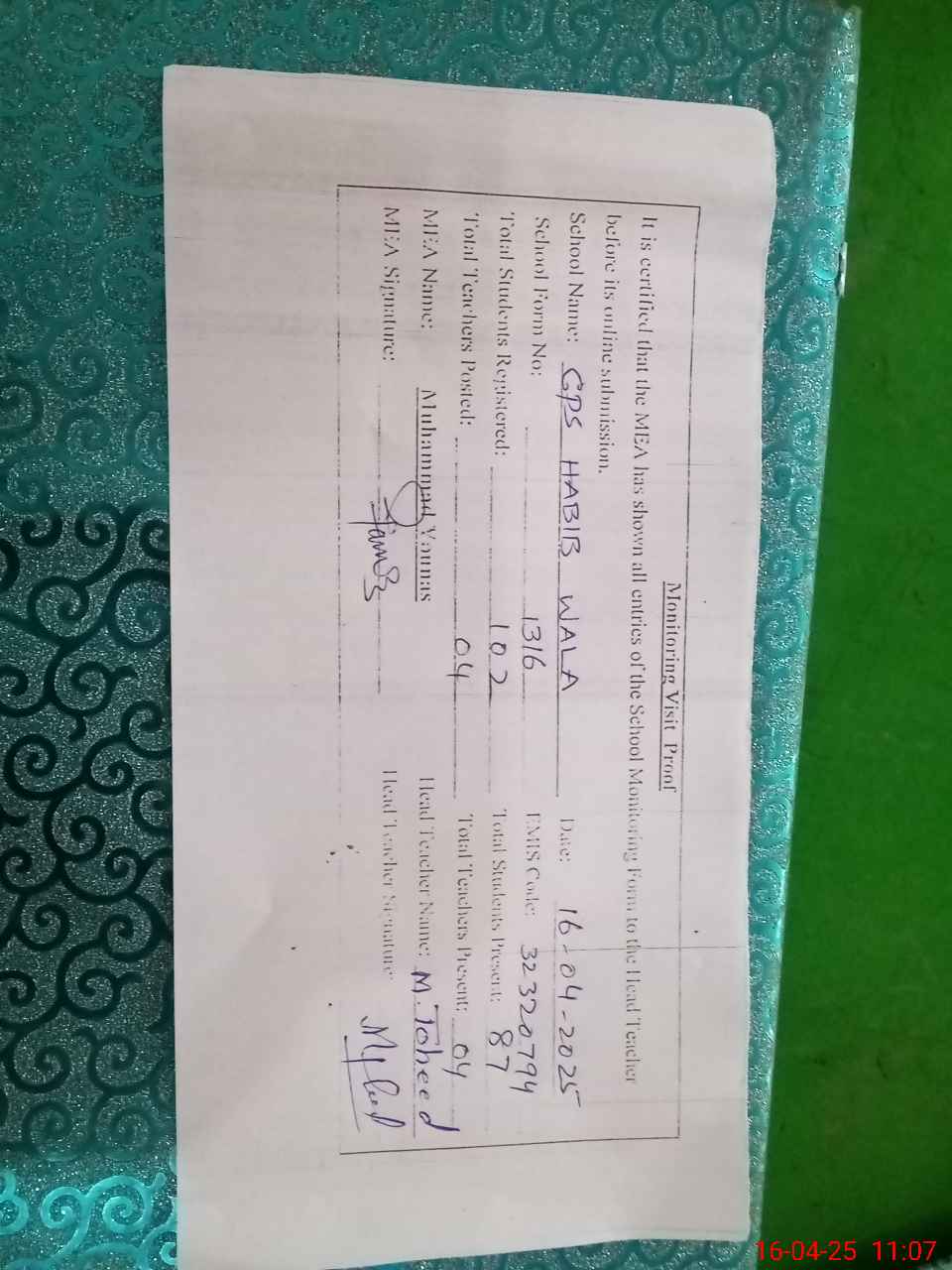 | EMIS Code: 32320794 | Name of School: GPS HABIB WALA | |||