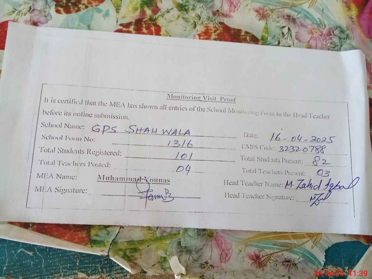 | EMIS Code: 32320788 | Name of School: GPS SHAH WALA | |||