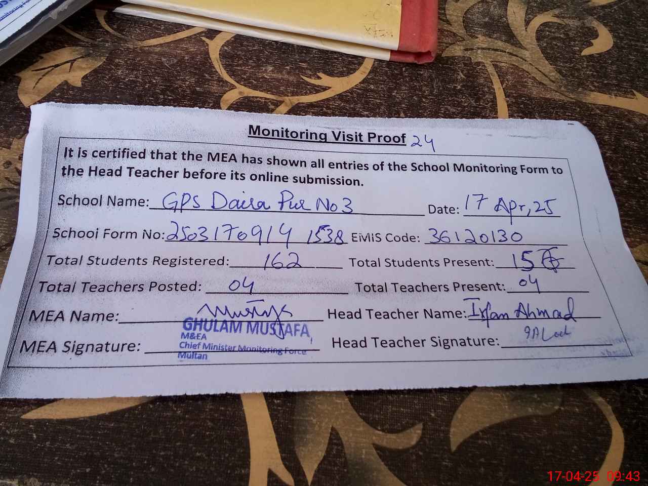 | Attendance Register | Head Teacher | MEA with School | Visit Proof |