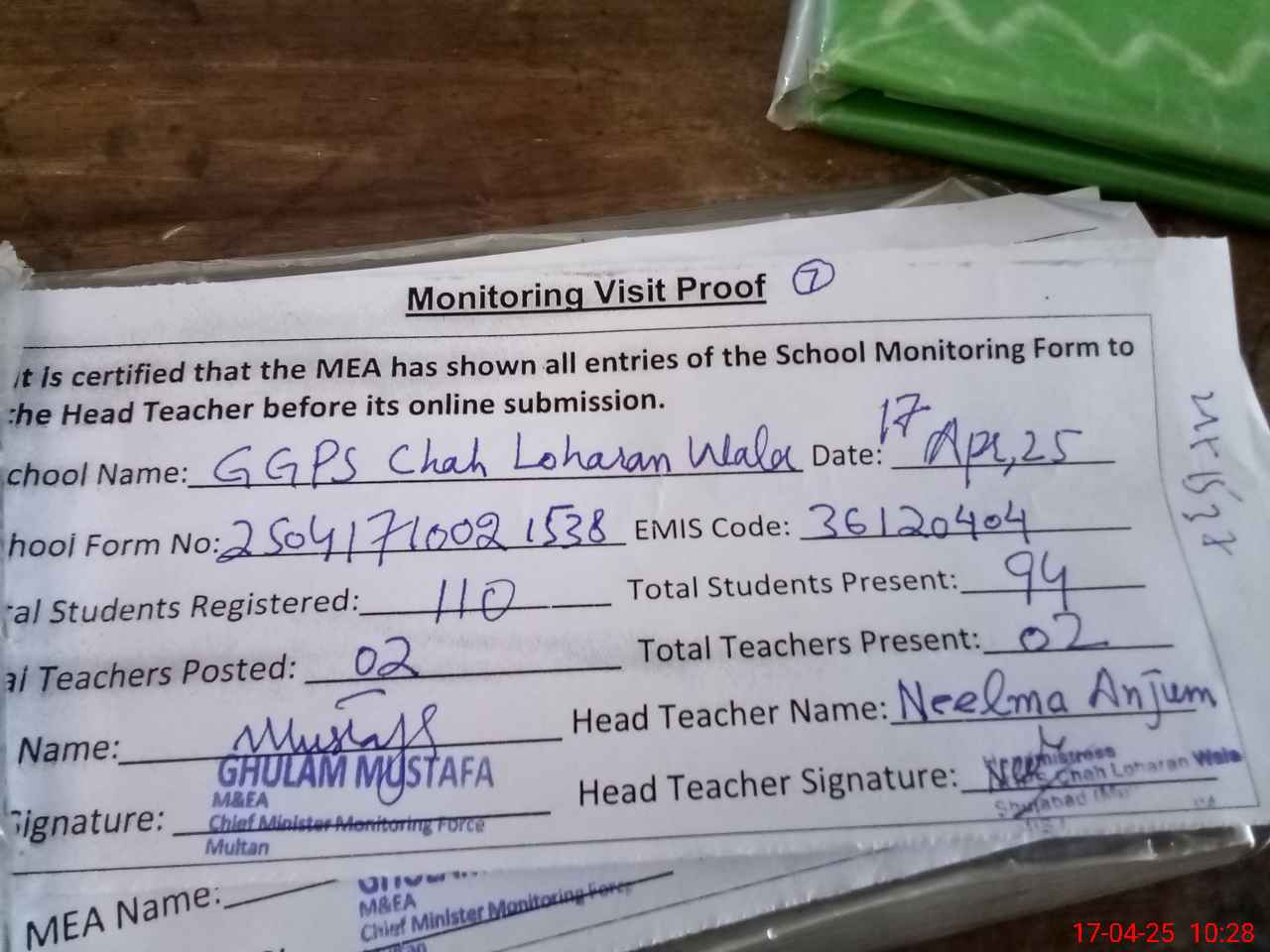 | Attendance Register | Head Teacher | MEA with School | Visit Proof |