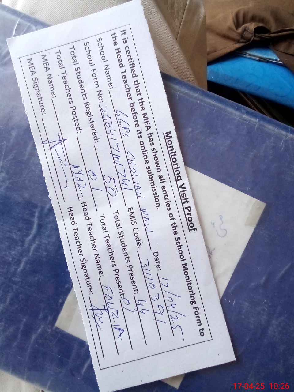 | Attendance Register | Head Teacher | MEA with School | Visit Proof |