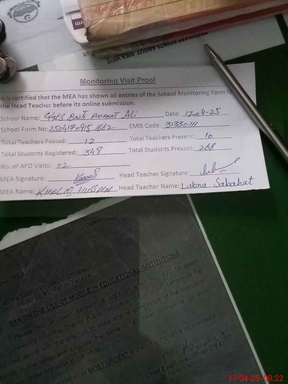 | EMIS Code: 31330111 | Name of School: GGES BASTI AMANAT ALI | |||
