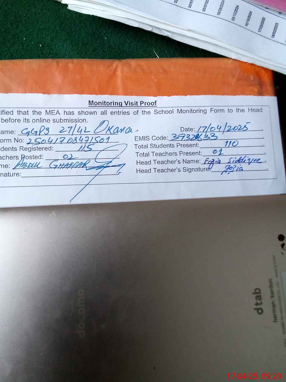 | Attendance Register | Head Teacher | MEA with School | Visit Proof |