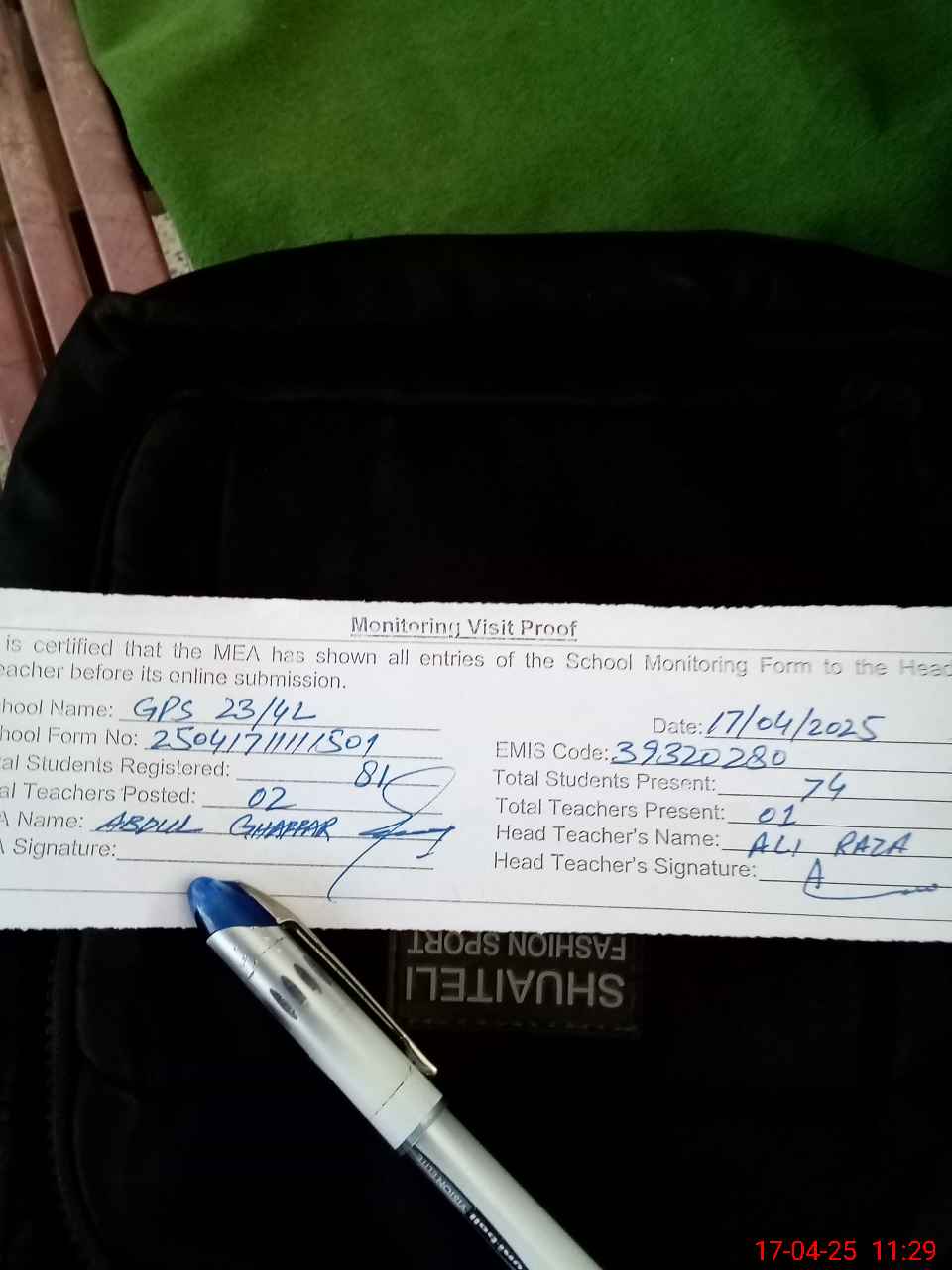 | Attendance Register | Head Teacher | MEA with School | Visit Proof |