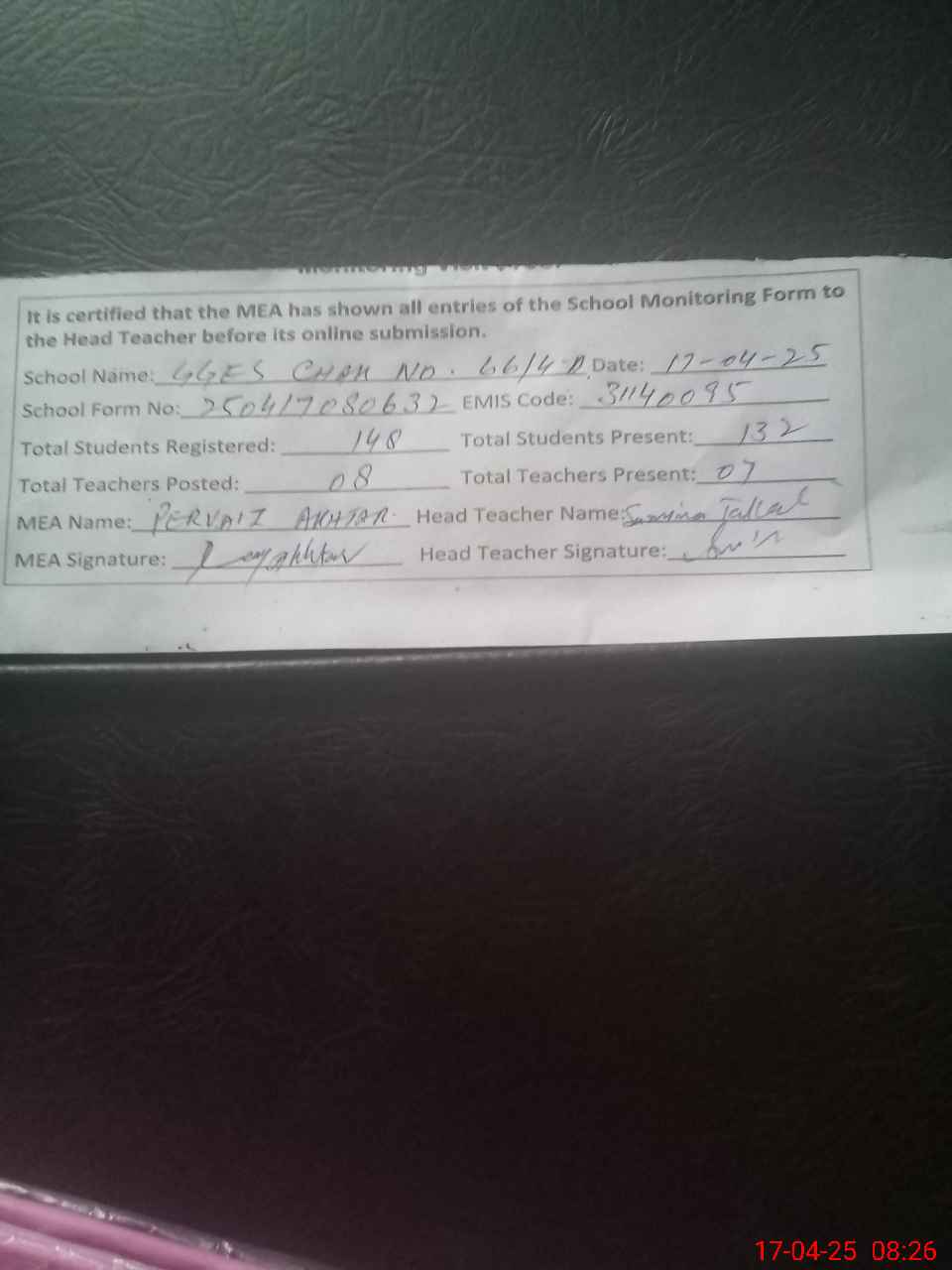 | Attendance Register | Head Teacher | MEA with School | Visit Proof |