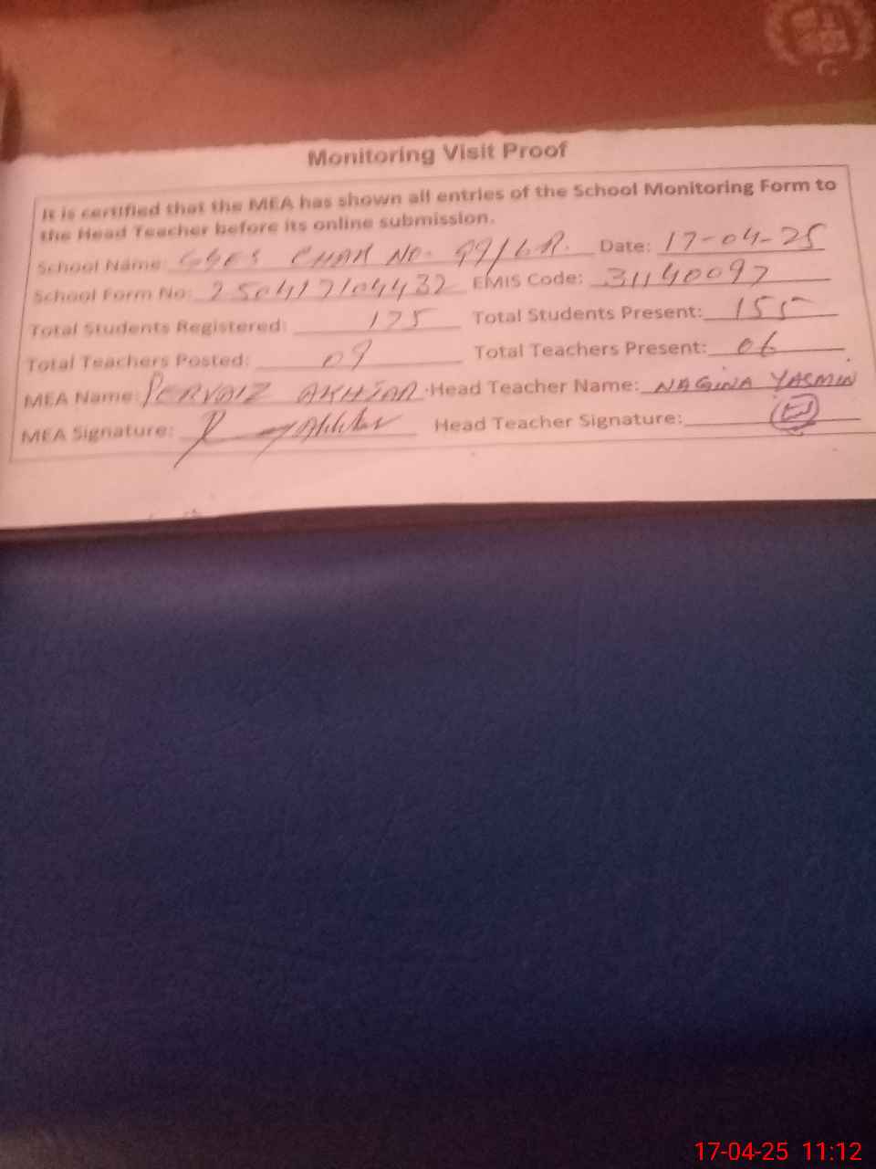 | Attendance Register | Head Teacher | MEA with School | Visit Proof |