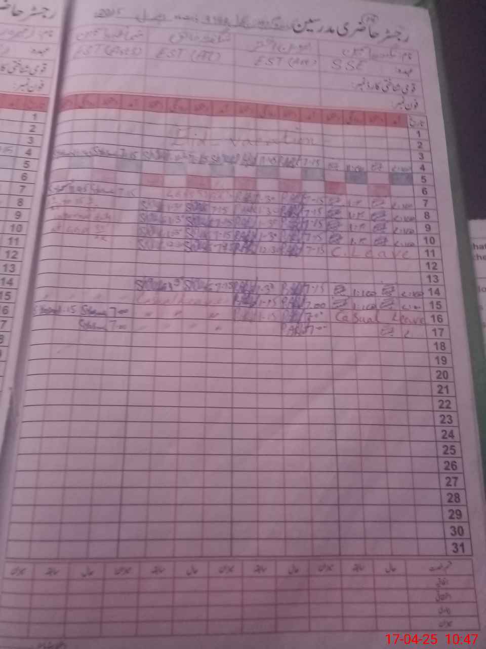 | 31**** | Zu**** Ri**** | 3 | 1 | 0 | 0 | 0 | 0 | 0 | 0 | 0 | 0 | 0 | Exam Duty |