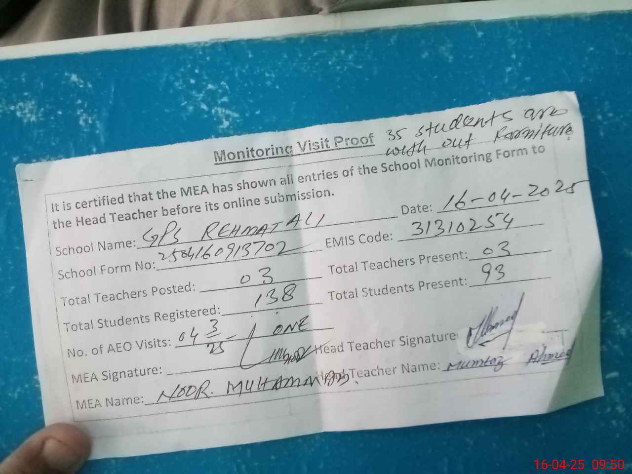 | Attendance Register | Head Teacher | MEA with School | Visit Proof |