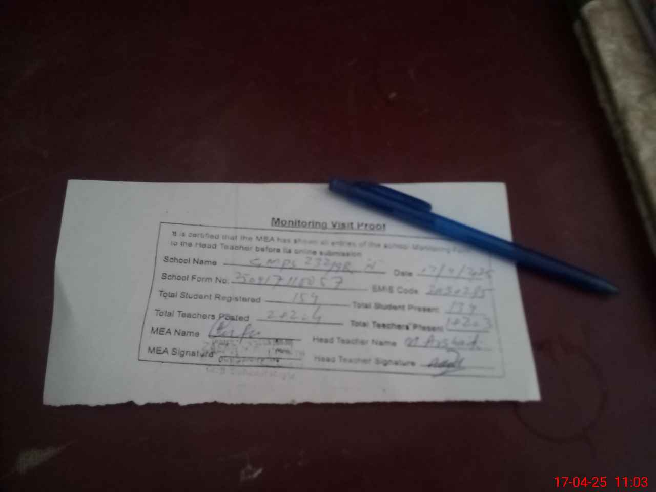 | Attendance Register | Head Teacher | MEA with School | Visit Proof |