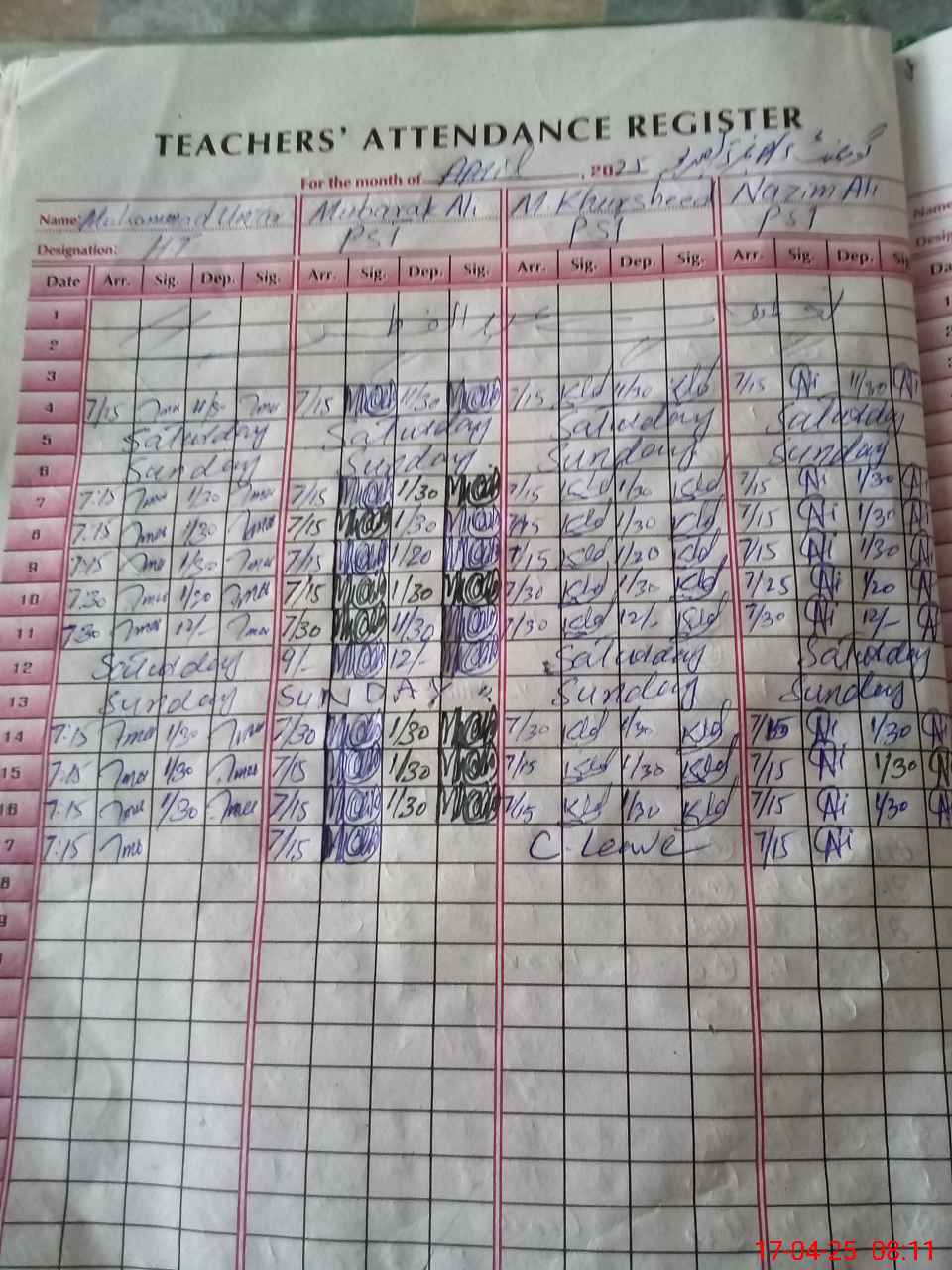 | CNIC | Full Name | Designation | R/C | Absence During Last Calender Month |