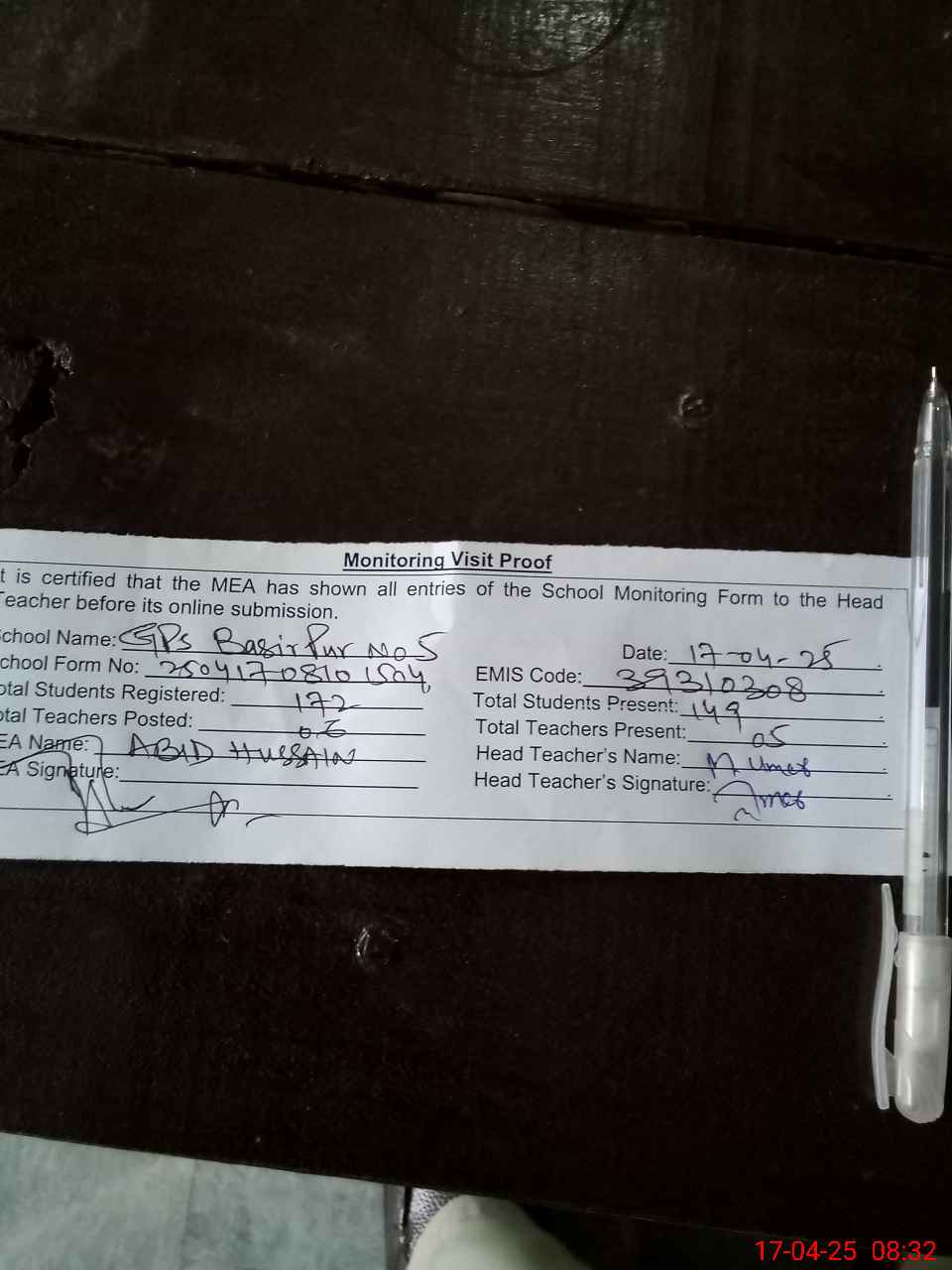 | Attendance Register | Head Teacher | MEA with School | Visit Proof |