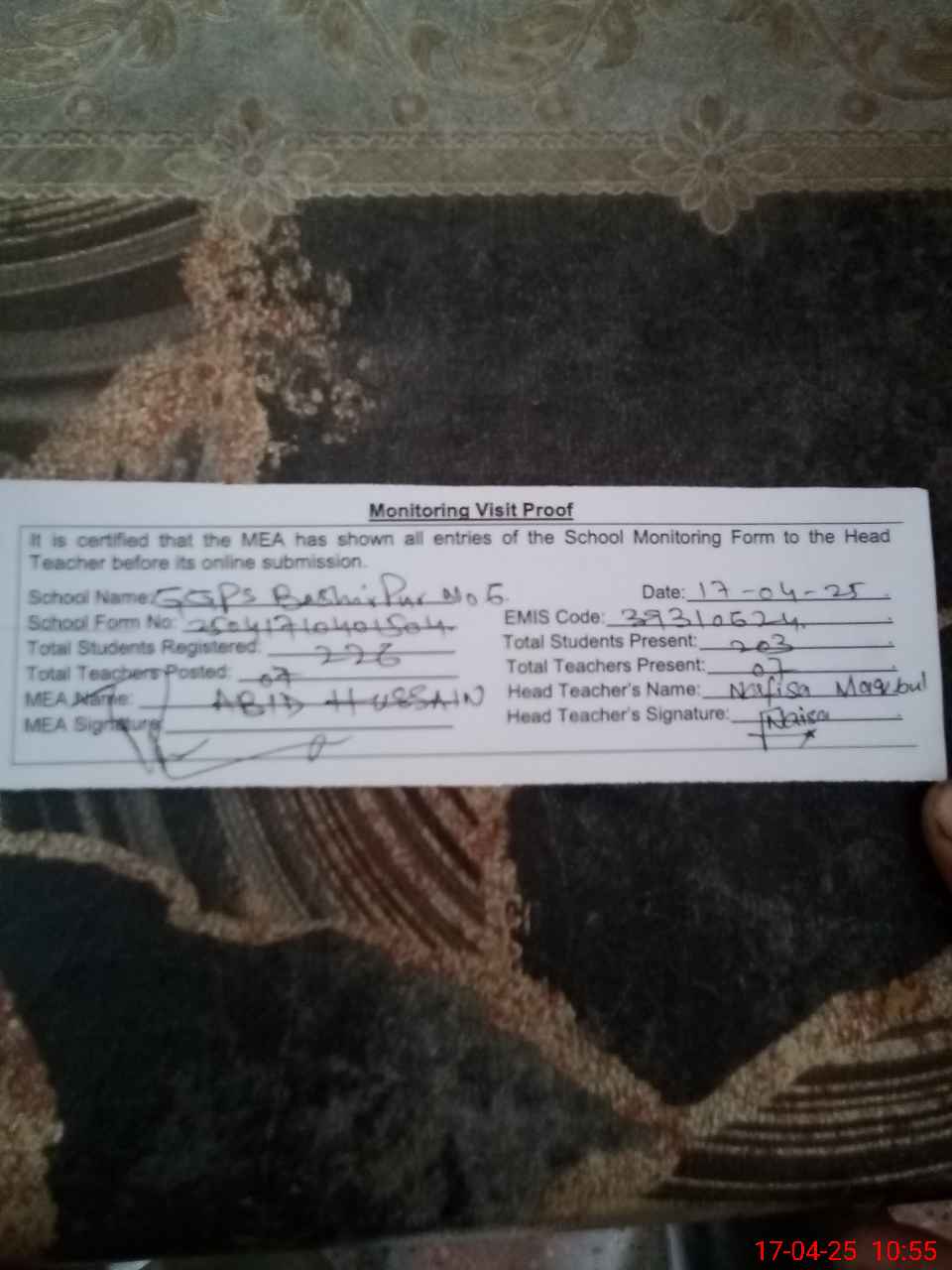 | Attendance Register | Head Teacher | MEA with School | Visit Proof |