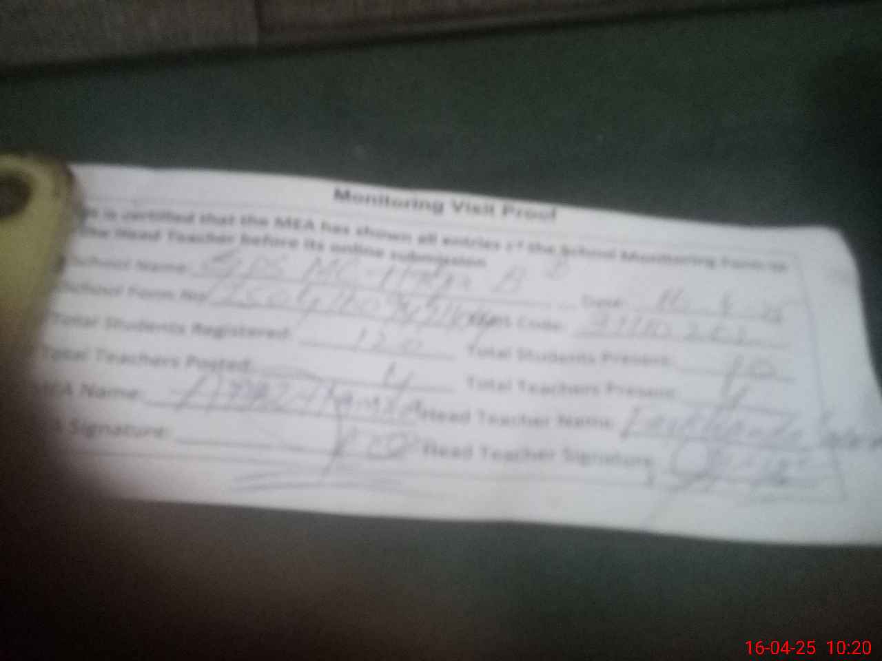 | Attendance Register | Head Teacher | MEA with School | Visit Proof |