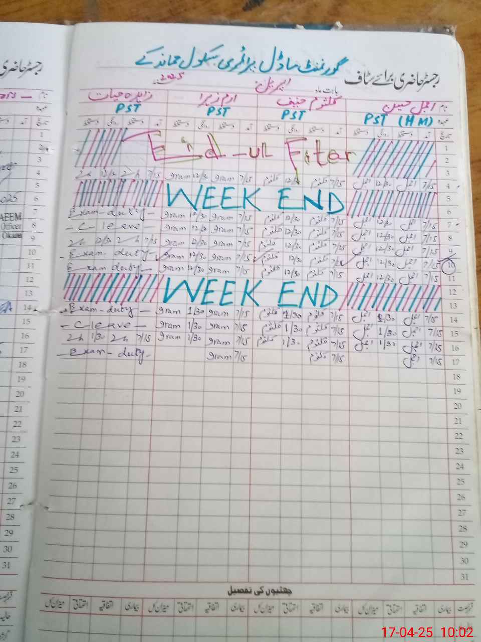 | 35**** | Za**** Ha**** | 1 | 1 | 0 | 0 | 0 | 0 | 0 | 0 | 0 | 0 | 0 | Exam Duty |