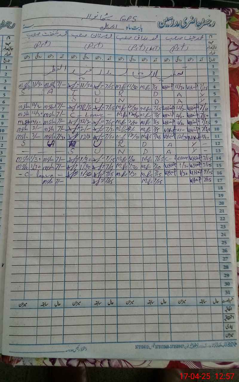 | CNIC | Full Name | Designation | R/C | Absence During Last Calender Month |