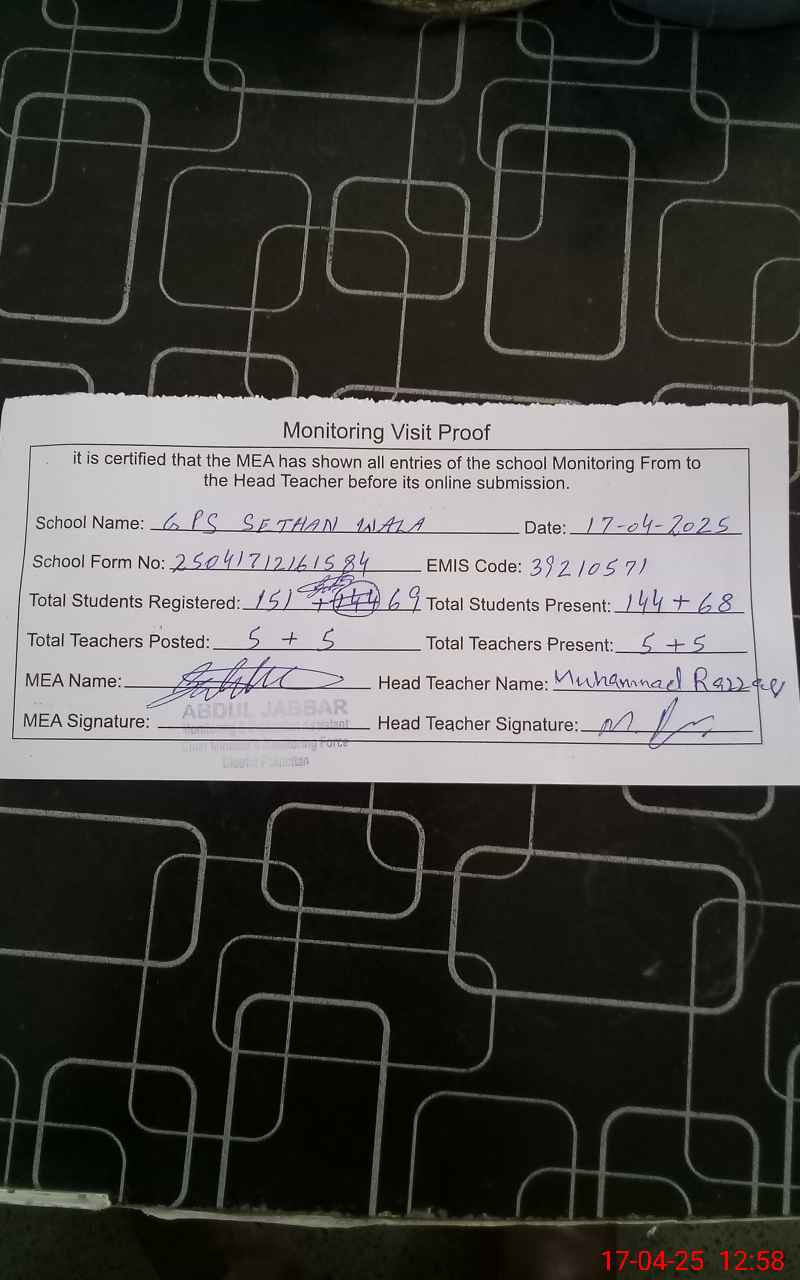 | EMIS Code: 39210571 | Name of School: GPS SETHAN WALA | |||