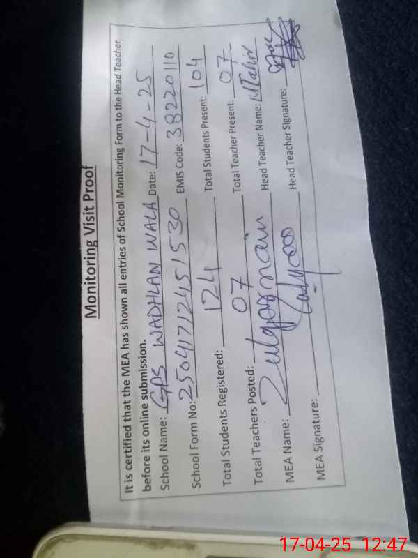 | Attendance Register | Head Teacher | MEA with School | Visit Proof |