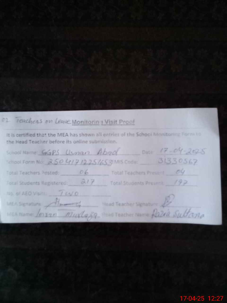 | EMIS Code: 31330567 | Name of School: GGPS USMAN ABAD | |||