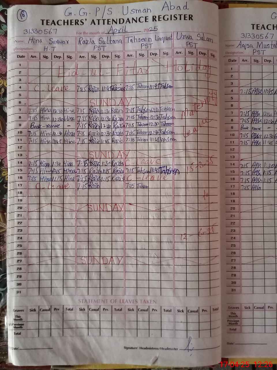 | Leave | Duty | Absent | Maternity | Medical | Ex- Pak |
