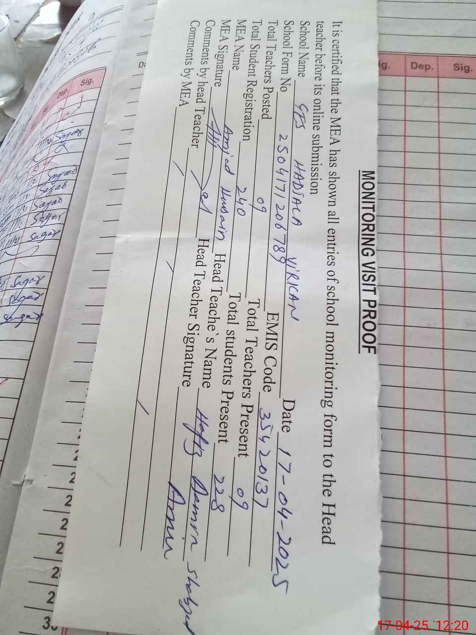 | Attendance Register | Head Teacher | MEA with School | Visit Proof |
