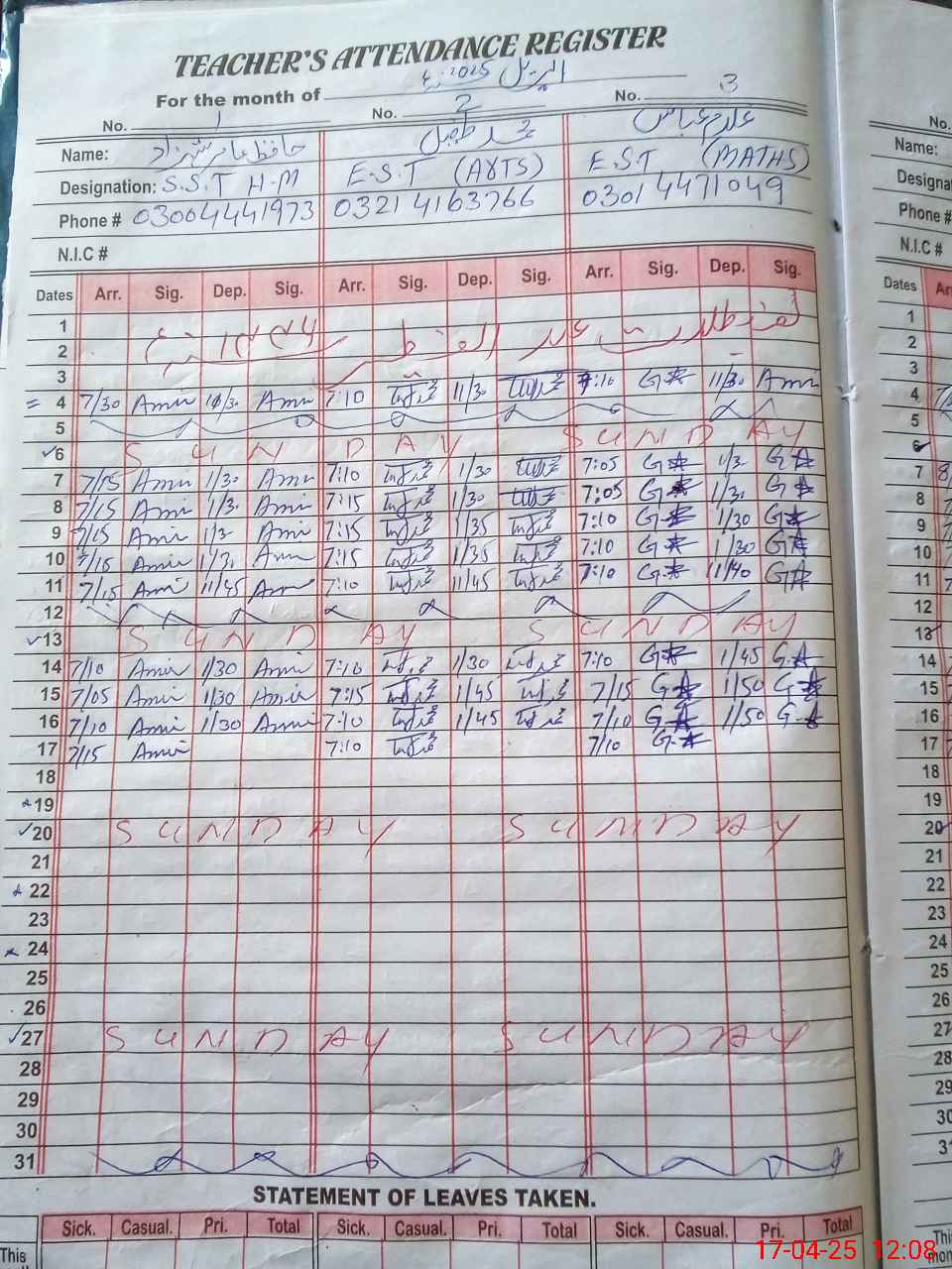 | CNIC | Full Name | Designation | R/C | Absence During Last Calender Month |