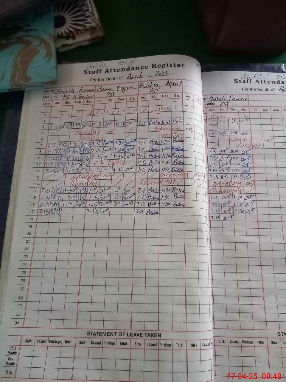 | Leave | Duty | Absent | Maternity | Medical | Ex- Pak |