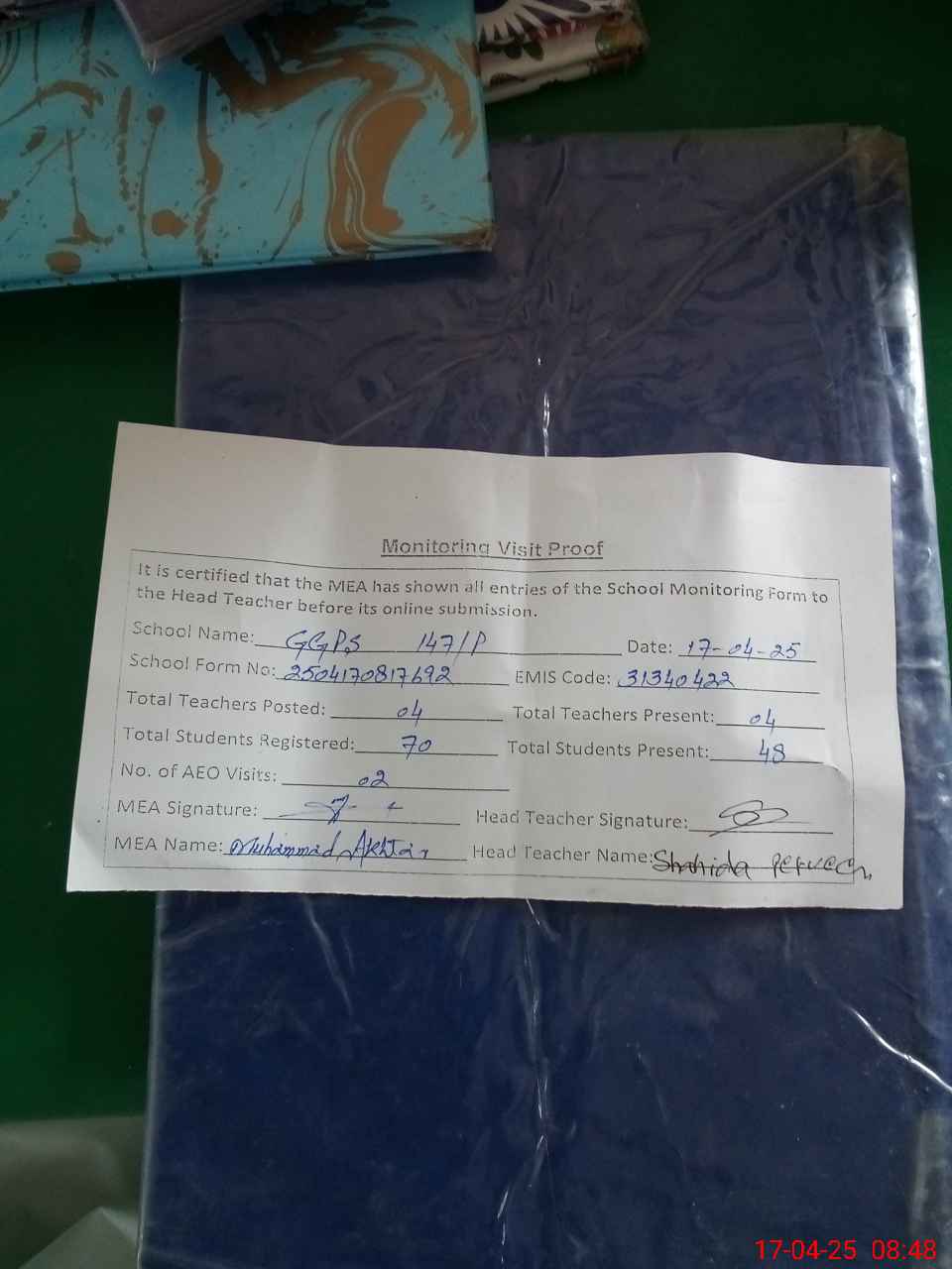 | Attendance Register | Head Teacher | MEA with School | Visit Proof |