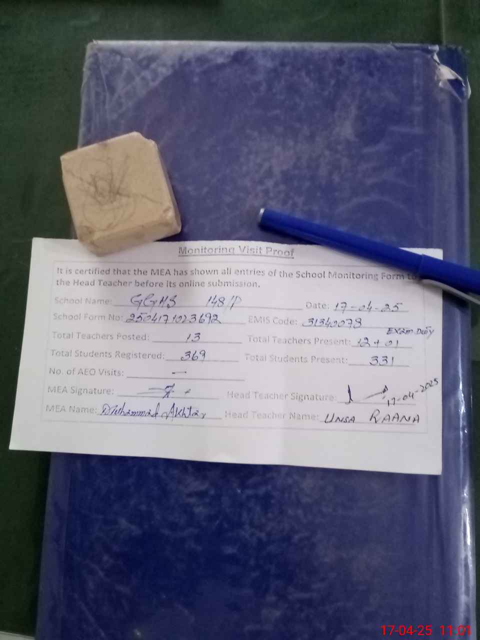 | Attendance Register | Head Teacher | MEA with School | Visit Proof |