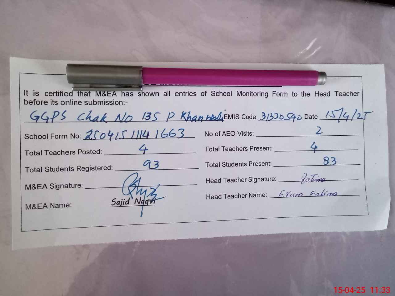 | Attendance Register | Head Teacher | MEA with School | Visit Proof |