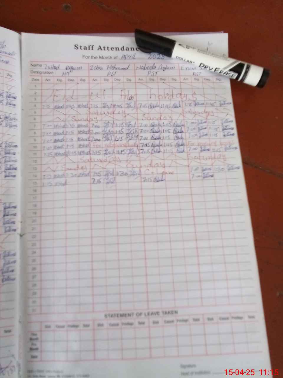| Leave | Duty | Absent | Maternity | Medical | Ex- Pak |