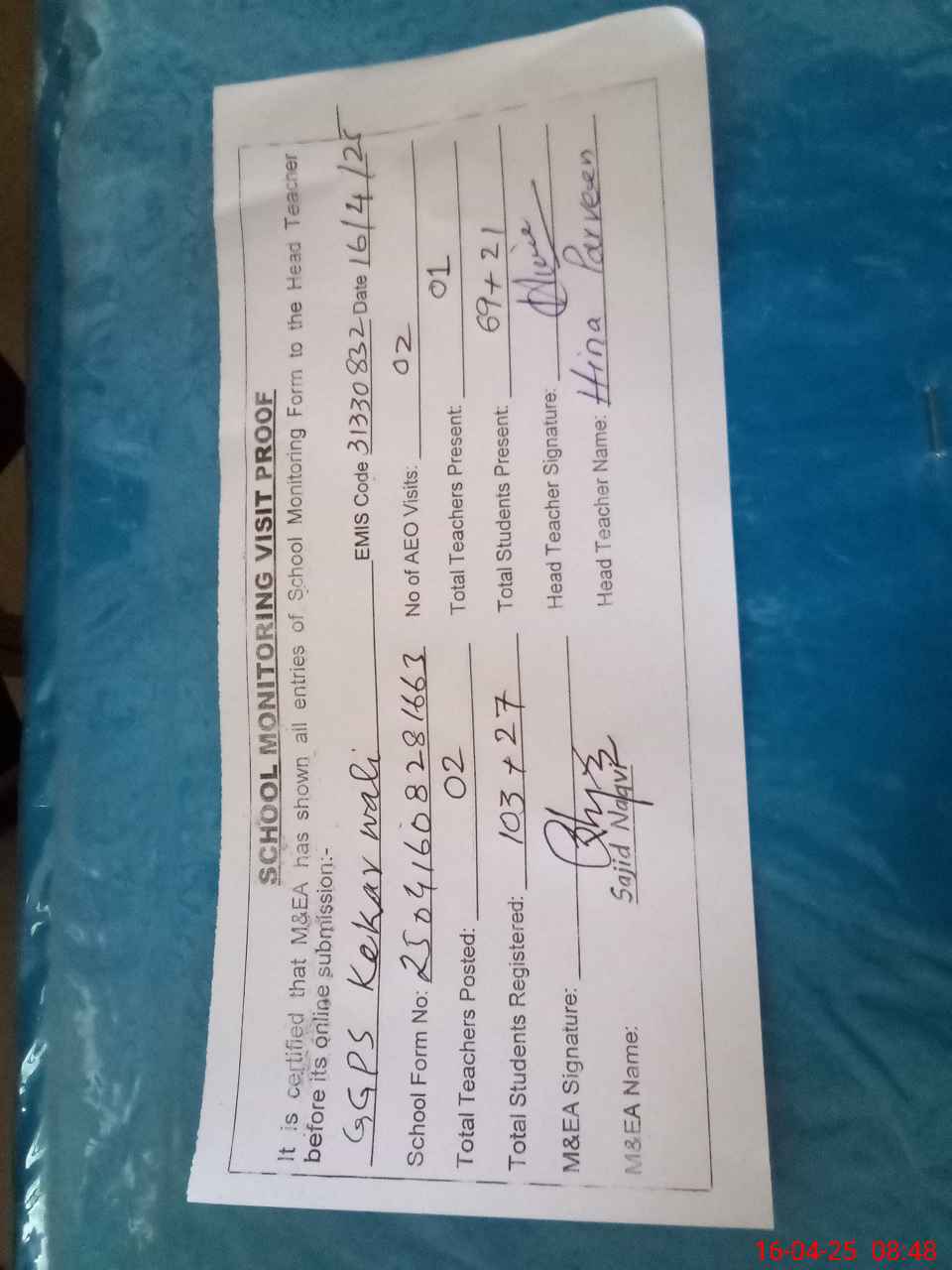 | Attendance Register | Head Teacher | MEA with School | Visit Proof |